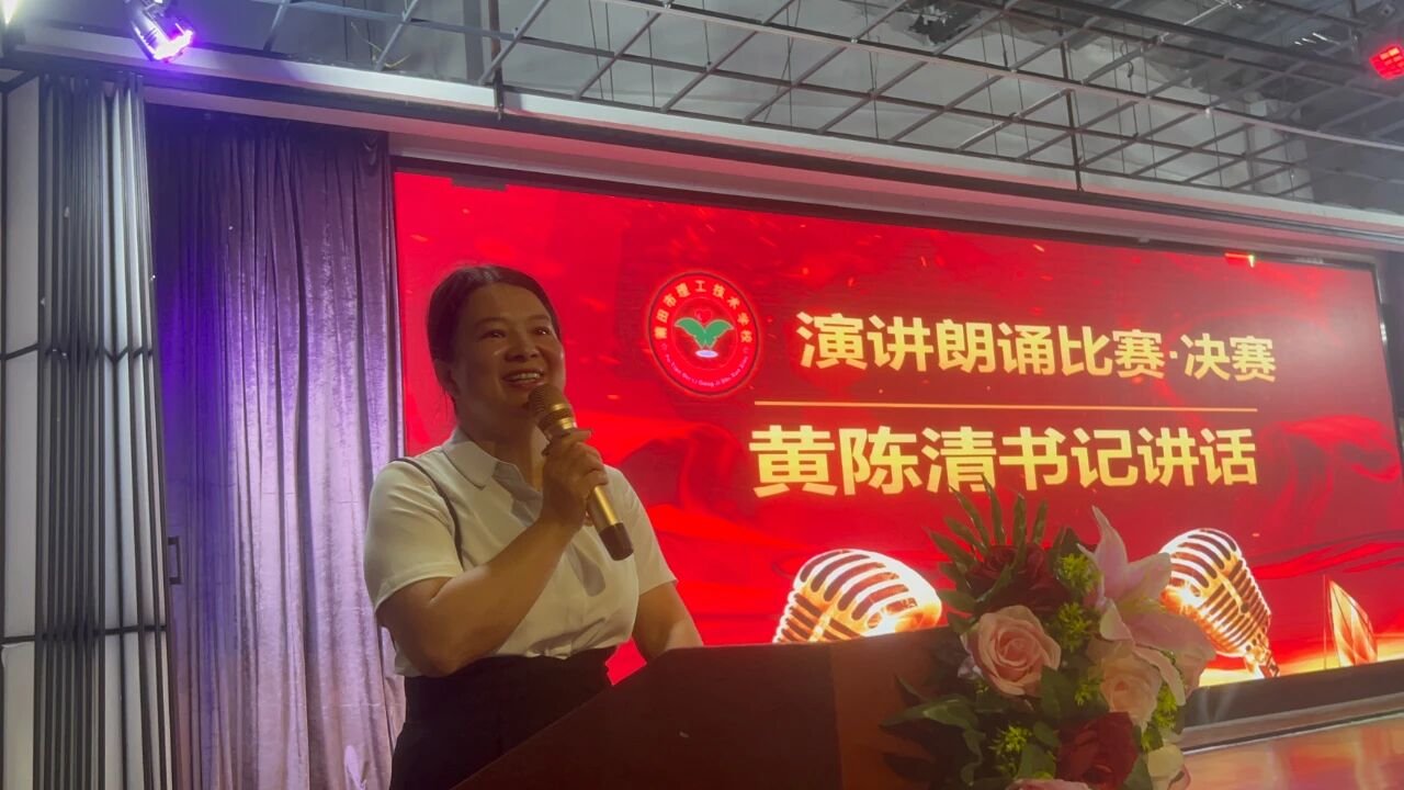 颁奖结束后,黄陈清书记作总结讲话。她对参赛选手的精彩表现给予高度肯定,认为同学们通过朗诵演讲,不仅展现了青春风采,更传递出对祖国的深厚情感。同时,她鼓励全体师生将这份爱国热情转化为学习与工作的动力,以 “匠心” 传承精神火种,在新时代为祖国发展贡献力量。
