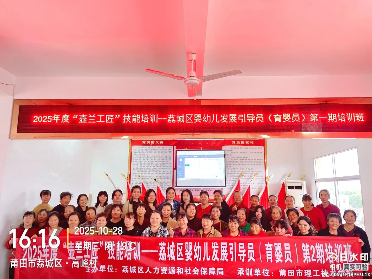 第二期(10 月 25 日 - 28 日):在荔城区北高镇高峰村老岑 397 号(高峰村民委员会)举办,49 名学员参训。课程设置更系统,涵盖职业道德、婴幼儿发育基础、生活照料、营养知识、保健护理、法律法规、幼儿训练、教育实施、游戏训练等模块,林林、杨慧婕两位老师分阶段授课,使用同款教材。10 月 28 日进行考核,规则同前。