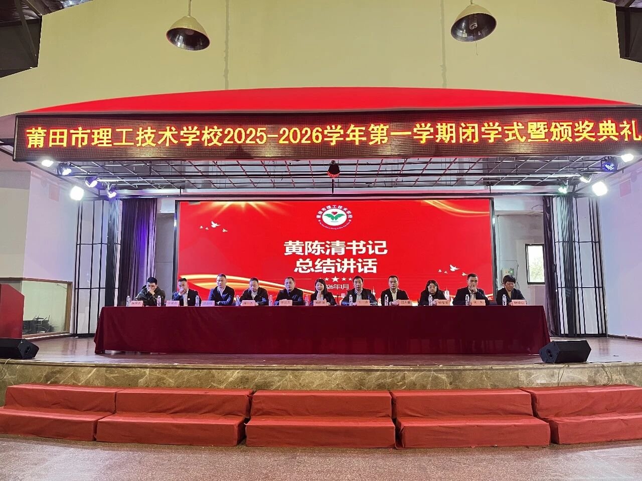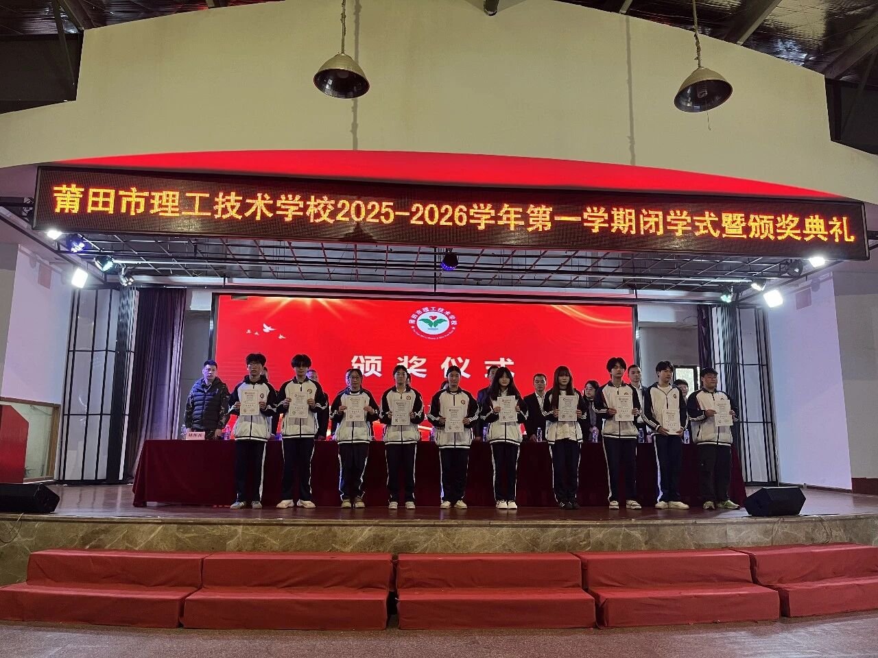 2026 年 1 月 30 日上午 10 时,莆田市理工技术学校大礼堂内暖意融融、掌声阵阵,2025-2026 学年第一学期闭学式暨颁奖典礼准时启幕。学校领导黄陈清、王潇等出席,25 级全体学生及各班获奖代表齐聚礼堂现场,其余学生通过教室直播同步参与,共同见证这一承载荣耀与期许的时刻。