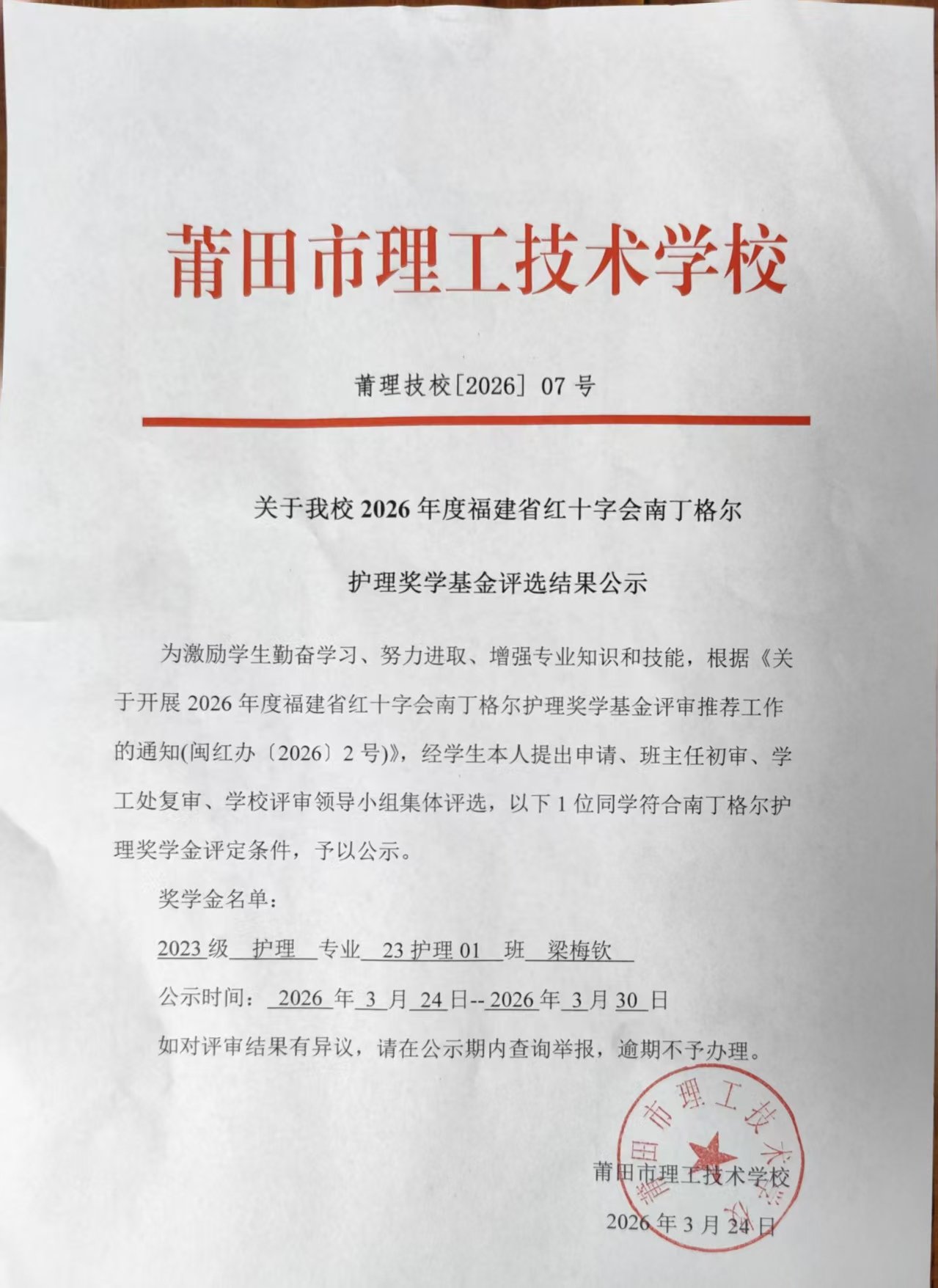 关于我校2026年度福建省红十字会南丁格尔护理奖学基金评选结果公示