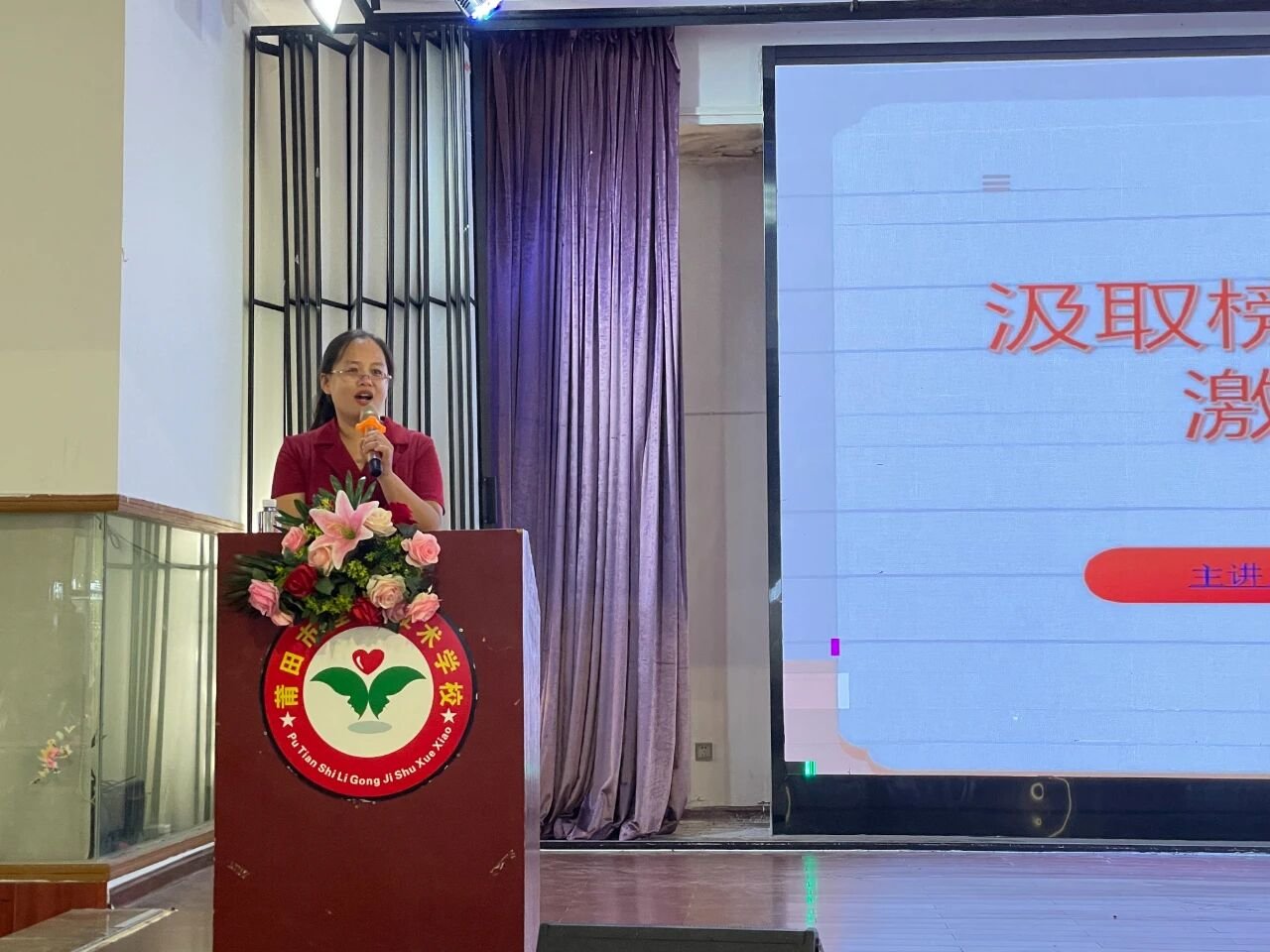 9 月26 日下午,莆田市理工技术学校的大礼堂里暖意融融,“汲取榜样力量 激扬青春梦想”主题宣讲活动在此温情开讲。本次宣讲由城厢区新时代文明实践中心、城厢区委宣传部(文明办)联合主办,莆田市理工技术学校承办。师生们共同聆听榜样故事,感受道德力量。