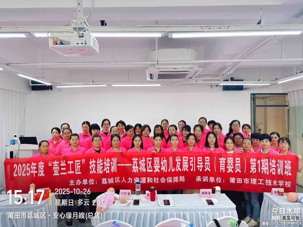 为助力农村转移就业劳动者提升职业技能、拓宽就业渠道,2025 年 10 月,由荔城区人力资源和社会保障局主办、莆田市理工技术学校承办的 “揭榜挂帅” 及“壶兰工匠”系列技能培训班在荔城区顺利开展,涵盖养老护理员、婴幼儿发展引导员(育婴员)等领域,为当地养老、婴幼儿照护等民生服务行业精准输送专业人才,推动就业与产业发展深度融合。