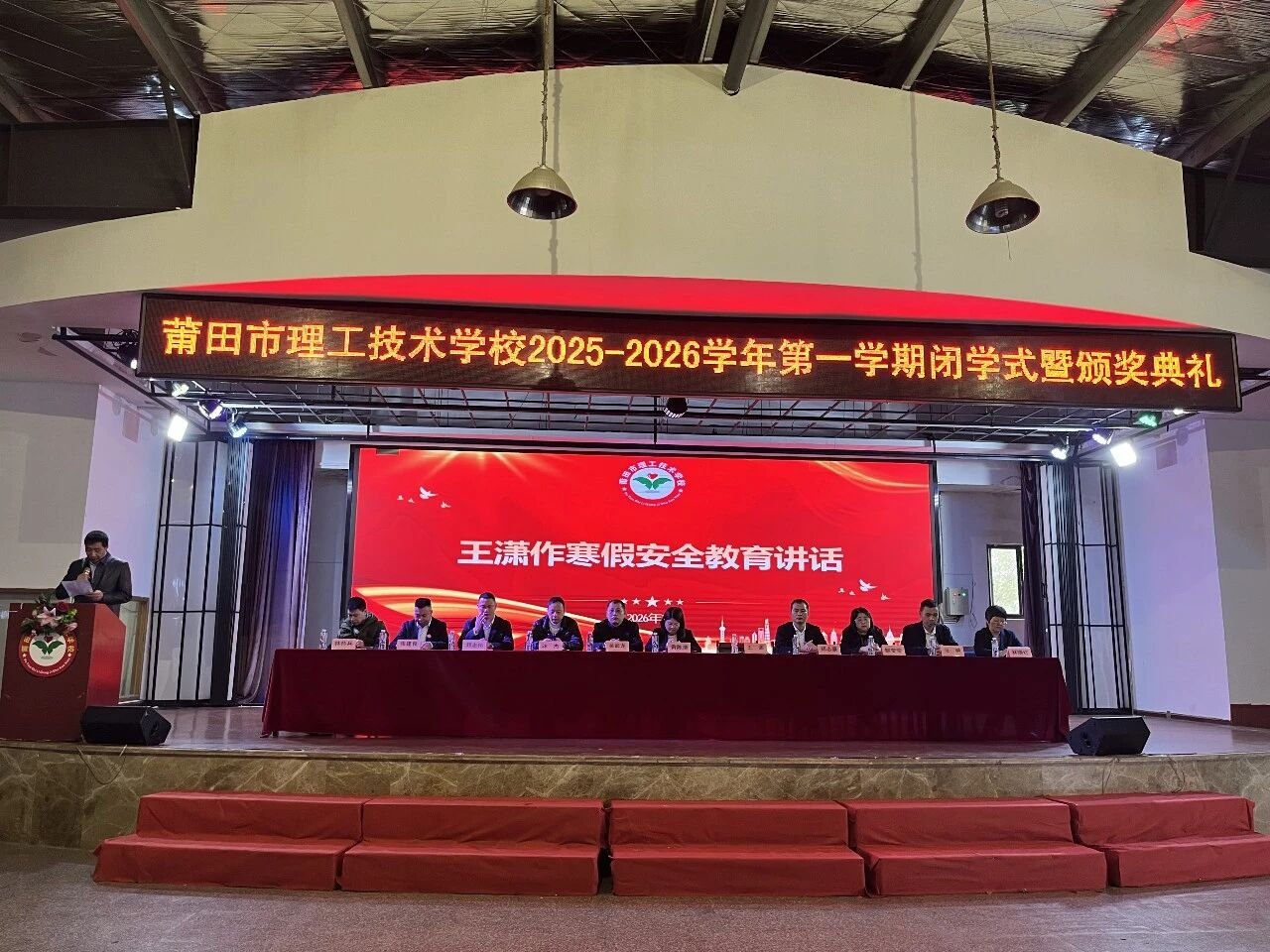 2026 年 1 月 30 日上午 10 时,莆田市理工技术学校大礼堂内暖意融融、掌声阵阵,2025-2026 学年第一学期闭学式暨颁奖典礼准时启幕。学校领导黄陈清、王潇等出席,25 级全体学生及各班获奖代表齐聚礼堂现场,其余学生通过教室直播同步参与,共同见证这一承载荣耀与期许的时刻。